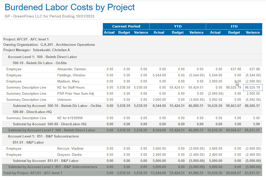 This is a sample of the Burdened Labor Costs by Project report.