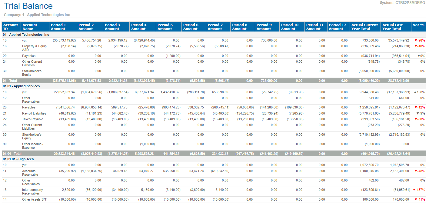 The Trial Balance report can display periods and balances based on Organization or Account.