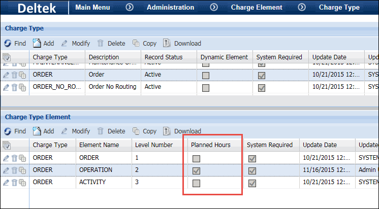 For example, if the Charge Element ORDER has three levels – Order, Operation, and Activity, and Operation has the Planned Hours box checked, then the Planned/Actual/Remaining Hours will be calculated based on the Planned Hours defined for the Operation on the Charge Element form.