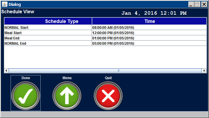 The Schedule View form will list the schedule’s start and end times, including meals, breaks, and optional schedule times.
