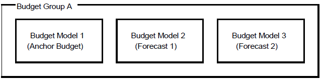 A budget group consists of a number of budget models, for example, an anchor budget and several forecast budgets as in the example below.
