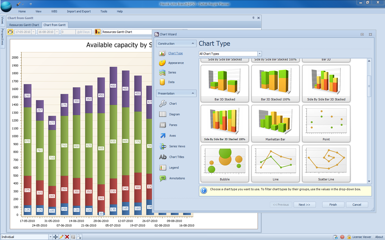 This means that you can dynamically print what you see in the window. In addition, People Planner allows you to create charts that are similar to Excel charts.