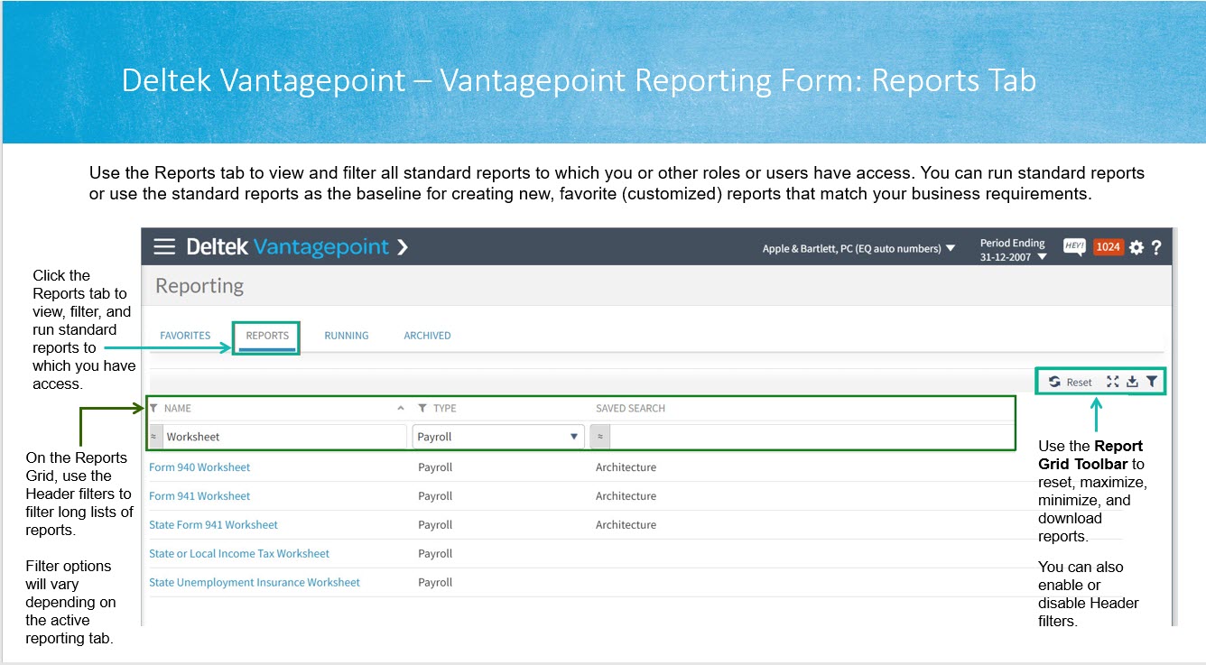 Vantagepoint includes a set of standard reports that are designed to meet typical reporting needs. You can add records to these reports and run them with the standard options selected or use the reports as the baseline for creating favorite (customized) reports that match your business requirements.
