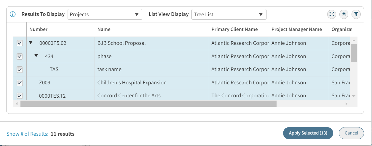 Depending on your record level security, you can use the Advanced Search feature in the Projects hub to view project levels (projects, phases, tasks, or all levels) for each search condition. In the Record Results section, you can choose how you want your records displayed. In the Record to Display drop-down list, select a project level option to display returned records arranged by project level. In the List View Display drop-down list, select a display option to list project level records in either a hierarchical structure or a flat list, in both the Record Results grid and in list view for saved or ad-hoc Selection searches.
