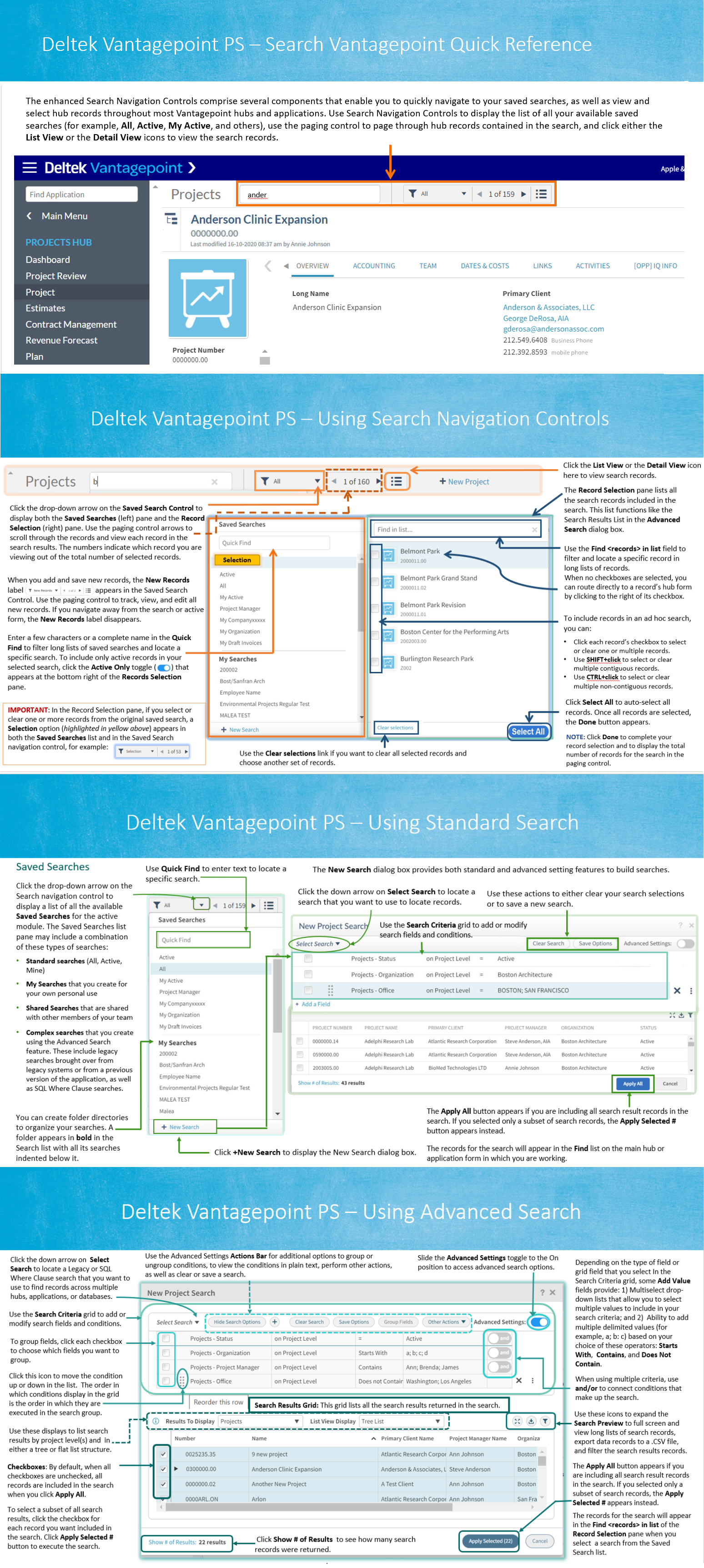 This quick reference card provides an overview of Vantagepoint's enhanced search navigation controls as well as standard and advanced search features.