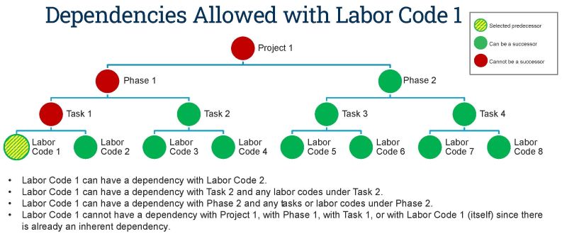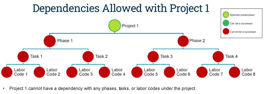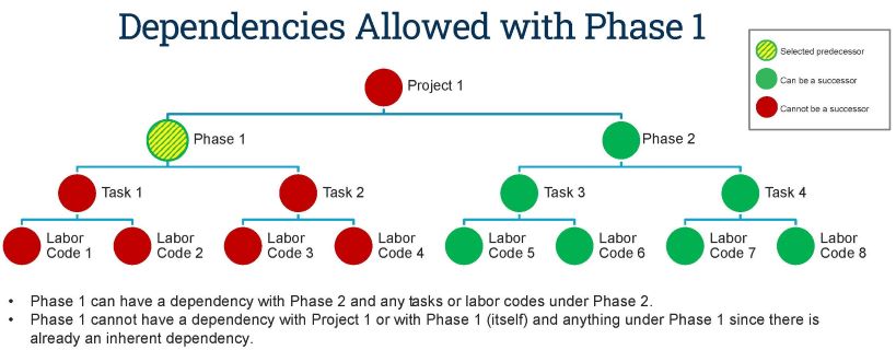 You can create relationships between any levels except the project level. You can create a dependency relationship between a task and a phase or between a phase and a labor code, as long as they are not in the same parent/child branch. The illustrations below show the allowed dependency relationships for a selected predecessor in each WBS level under a project: