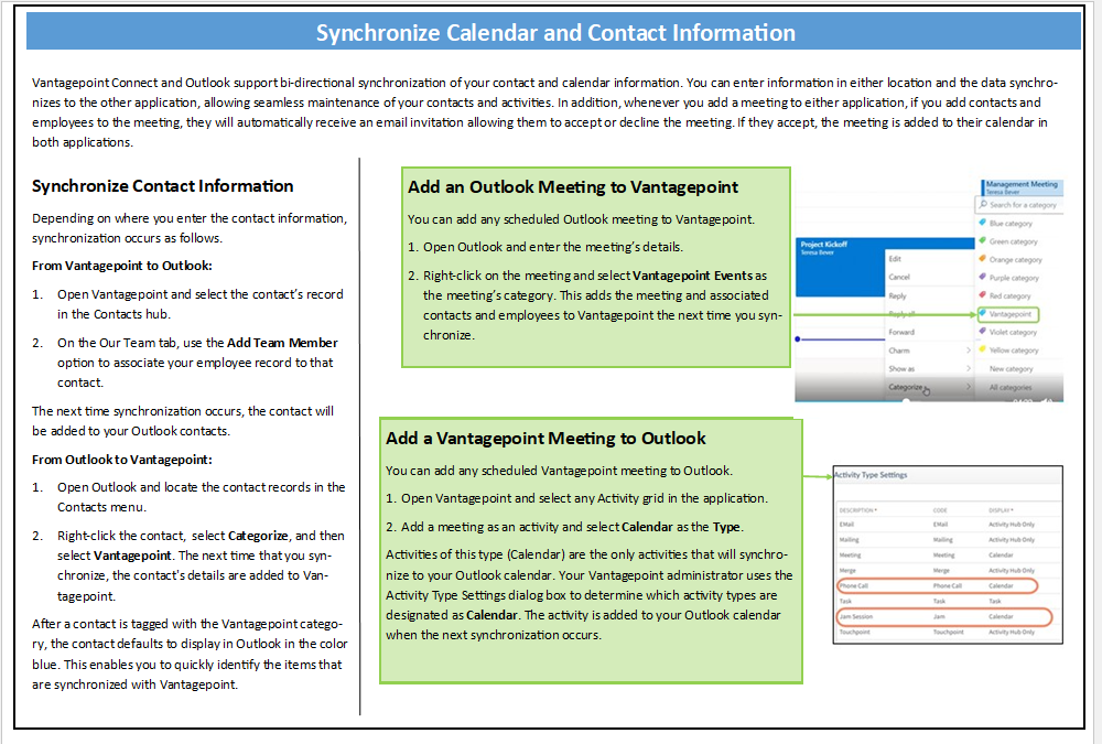 This quick reference provides an overview of how to synchronize your Outlook and Vantagepoint calendars and contacts.