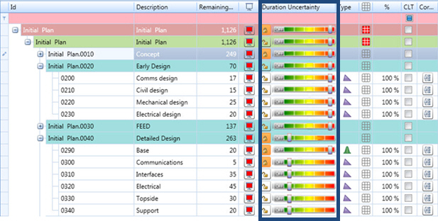 As you assign an uncertainty factor value to any given parent node, all children nodes automatically inherit the same applied Uncertainty Factor category. This top-down inheritance approach results in an extremely fast means of applying uncertainties to large schedules.