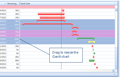In the Activity view, on the right side of the S1 // Projects tab screen, the project displays as a Gantt chart, called a SmartGantt.