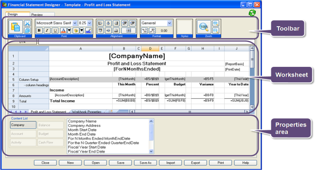 About financial statement designsOverviewUse the Financial Statement Designer to create the financial statement designs you want. You can create and print balance sheets, profit and loss statements, statements of cash flow, company budgets, key ratios, and other financial statements needed by your firm. You can begin in one of two ways: (1) start with a blank worksheet and create your own design, or (2) open a template and make changes to fit your needs. Worksheets in a workbookIf you want, you can design a different financial statement on each worksheet in the workbook. For example, a workbook can contain worksheets for a balance sheet, profit and loss statement, and statement of cash flows. Each workbook contains a Workbook Properties sheet that allows you to set global properties for each worksheet and for the entire workbook. Financial Statement DesignerThe basic actions in the Financial Statement Designer are select, define, and view: