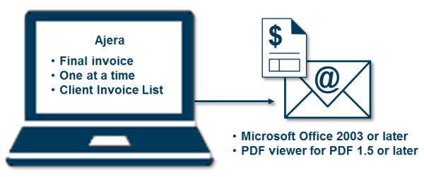 About emailing a client invoiceWith one action, you can email a client invoice directly from the Client Invoice List to the billing contact. You must have Microsoft Outlook 2003 or later, and the client invoice must have the status of Final. How it worksAjera takes the following information and uses it to create a Microsoft Outlook email, which you can edit before sending: