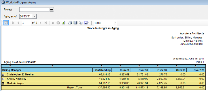 Here is a view of the Work-in-Progress Aging report, drilled down to the project level: