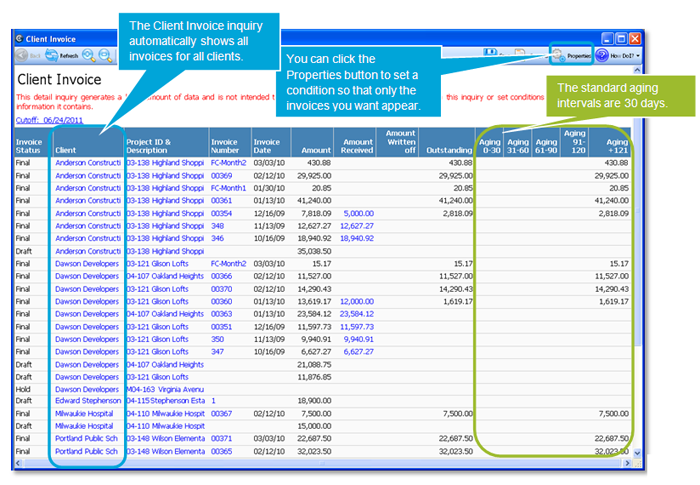 CollectionsManaging revenue flow, on paper and in the bank, is essential to forecasting cash flows and to improving your profitability. If your firm is not paid in a timely manner or is, in fact, not paid at all, your bottom line and your operational efficiency suffer. To guard against this, Ajera provides you with several tools for tracking client invoices and monitoring accounts that are fast becoming past-due. You can then take appropriate action at each stage in the aging cycle and maintain control. Track client invoices with reports and inquiriesWhen you set up and save a project in Ajera, it automatically creates a draft client invoice for you. As you enter time and expense, vendor invoices, and in-house expenses to the project, Ajera automatically adds the billing amounts to the draft invoice. During the project, you can review these reports and inquiries to keep up-to-date on the status of your client invoices:
