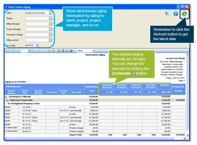 This report ages outstanding client invoices based on the invoice date or accounting date.