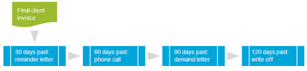 The Final stage, however, need not be the end of the process. You can set up a set of collections stages after that for tracking delinquent payments, each stage triggering a certain action from your firm. For example, at 15 days past payment, you might assign a Reminder stage to the client invoice that notifies accounting to send a reminder letter to the client. At 30 days past, you might assign a Call stage to the invoice that notifies accounting to follow up with a phone call to the client. As time progresses, each stage can trigger an incrementally more forceful action, perhaps culminating in handing over the account to a collections agency or to writing off the invoice.