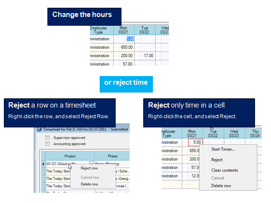 If you reject any hours on a timesheet, you cannot approve the timesheet. It is automatically unapproved and unsubmitted.