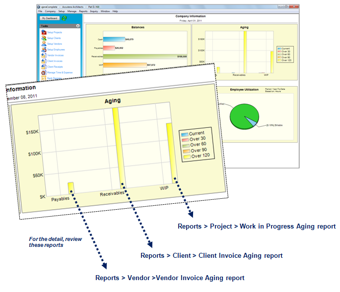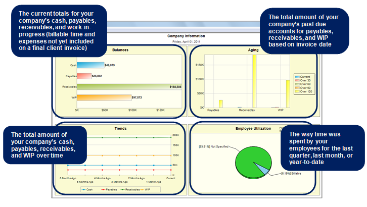Of use mainly to principals and accounting staff, the dashboard provides graphs and charts of key information that reflect the current state of your company. (Depending on your security settings, you may not have access to company information).