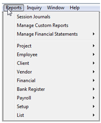 You can also view project, client, vendor, bank register, and payroll reports. Click Reports.