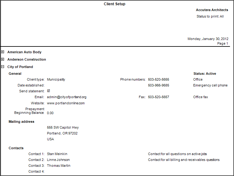For example, you can produce the Client Setup report to quickly reference various information about clients, such as the email address or contacts.