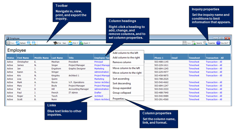 Use the toolbar to change the way you view the inquiry, to change properties for it, and to save, print, or export it.