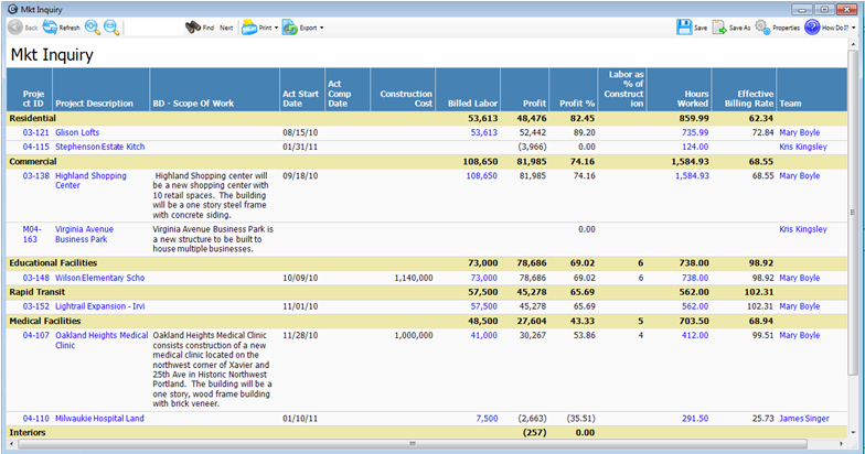 Project dates, project manager, project type, hours budgeted, hours worked, total contract amount, spent amount, billed amount, work-in-progress (WIP), and Reported Percent Complete (RPC) |
