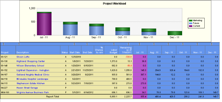 For example, your firm is trying to win a job that requires 300 hours of work. Your firm is competing against two other firms, and it is a new client for all firms, so you expect you have an even chance of winning: a 1-in-3 chance or 33 percent. That 33 percent appears as roughly 100 hours of potential work on the report. It appears in green so you can easily distinguish projected work from actual work.