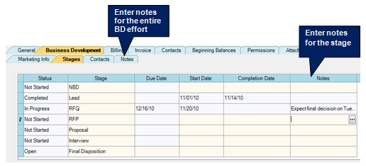 - Click the Business Development phase in the project tree at the left. Then click these tabs: Business Development > Stages.