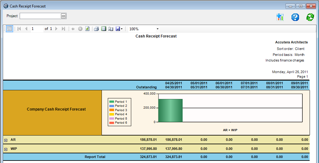 This report displays expected cash receipts for each of the next six weeks, months, or quarters from the date you print the report. You can produce the report for either all projects or just one selected project.