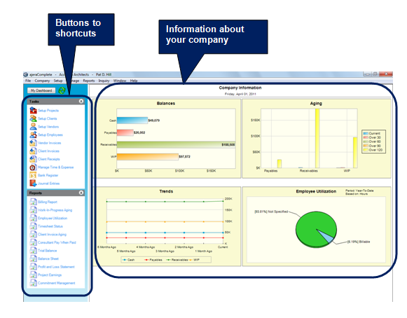 Display graphs and charts of key information for your company on your dashboard start-up page. It is an easy way to constantly review current information that reflects the state of your company.