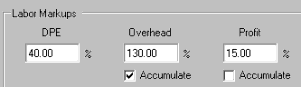 Each field contains a markup percent for applying that particular markup to all cost rates or amounts. Enter it as a percent, such as 40 for 40%. Enter a zero amount if you do not want to apply a markup.