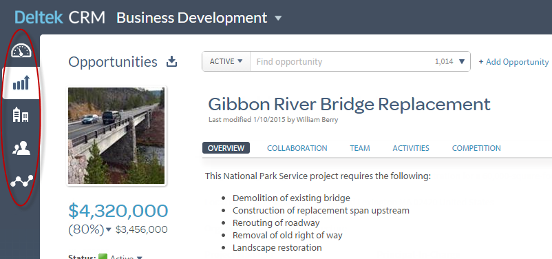 - Business Development: Use this workspace to manage all of the information, activities, and resources related to pursuing opportunities. You can also use this area to gather and maintain a repository of information on clients, partners, government agencies, contacts, and competitors.