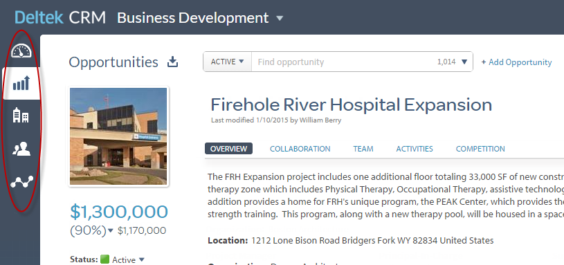 - Business Development: Use this workspace to manage all of the information, activities, and resources related to pursuing opportunities. You can also use this area to gather and maintain a repository of information on clients, subconsultants, government agencies, contacts, and competitors.