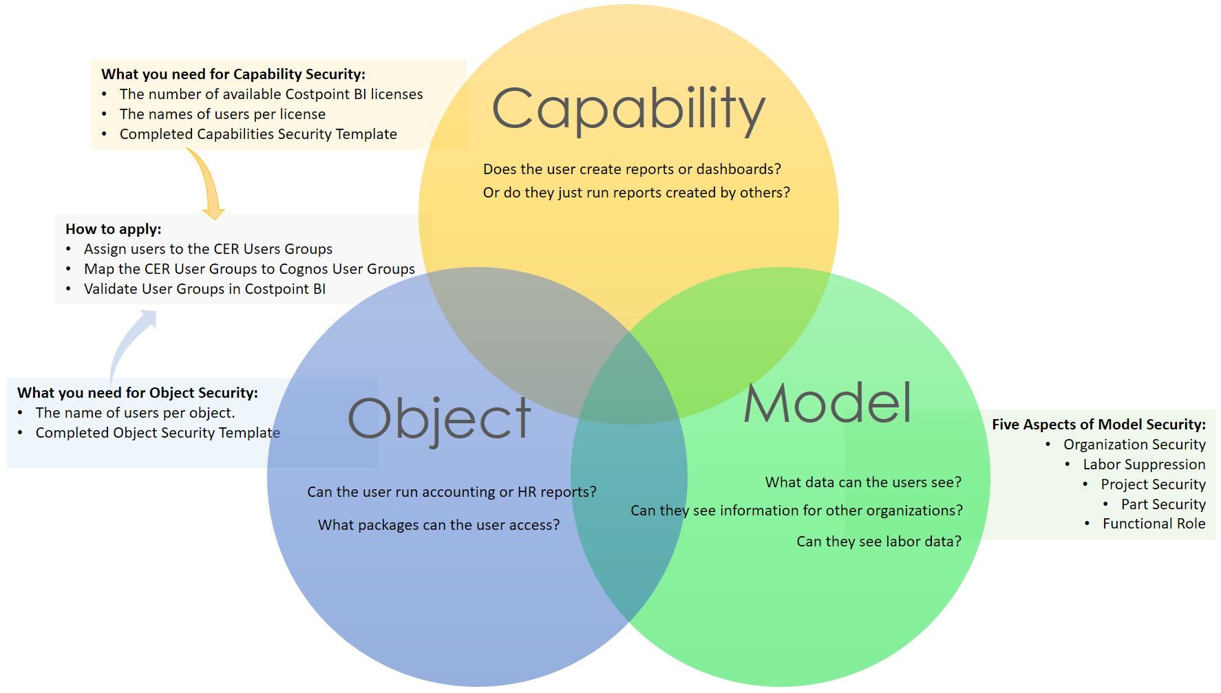 2. Object Security - This type of security determines what content an end user can see. User groups based on Costpoint domains are used to establish content security. For example, should the end user be able to access HR, Project, or Accounting type reports?