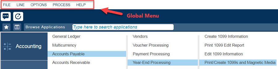 • OPTIONS: Contains options to select company data, search for data and records, navigate through records, and modify user preferences.