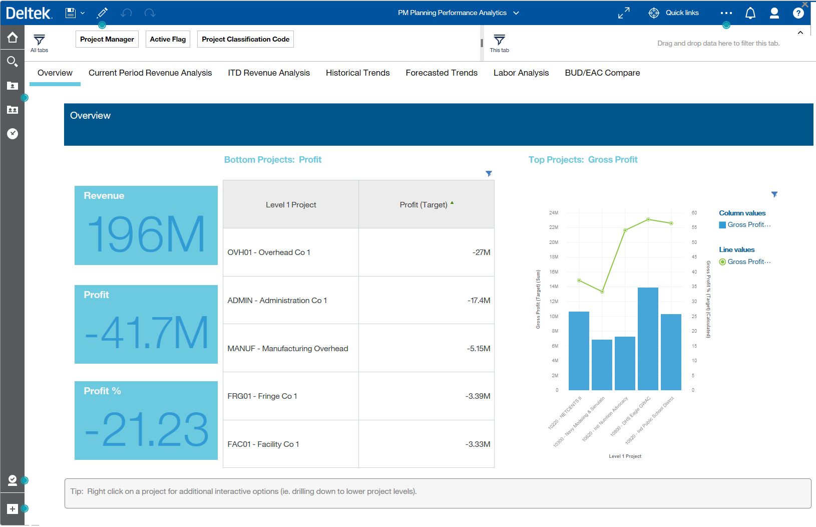 - Overview - This tab shows an incurred to date analysis for Revenue, Profit and Profit Percentages. It also provides a list report to show the Bottom 5 Projects based on profit and a bar chart to show the Top 5 Projects based on profit.