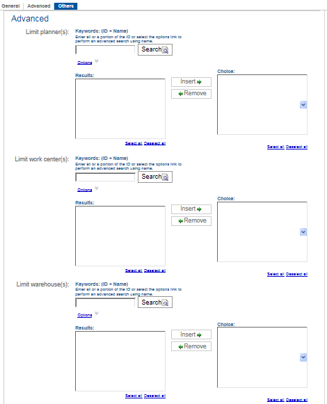 In the Keywords: (ID + Name) field, enter a portion or the entire ID of one or more work centers to add on the report. To narrow the search, click Options to select filter criteria. If you search by name, use one of the Contains... options, rather than the Starts with... options. If applicable, click the right arrow to move your selected results to Choices. |