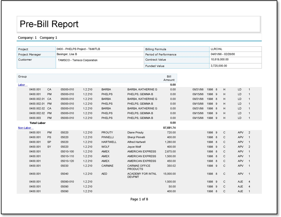 Sample Pre-Bill Report report.