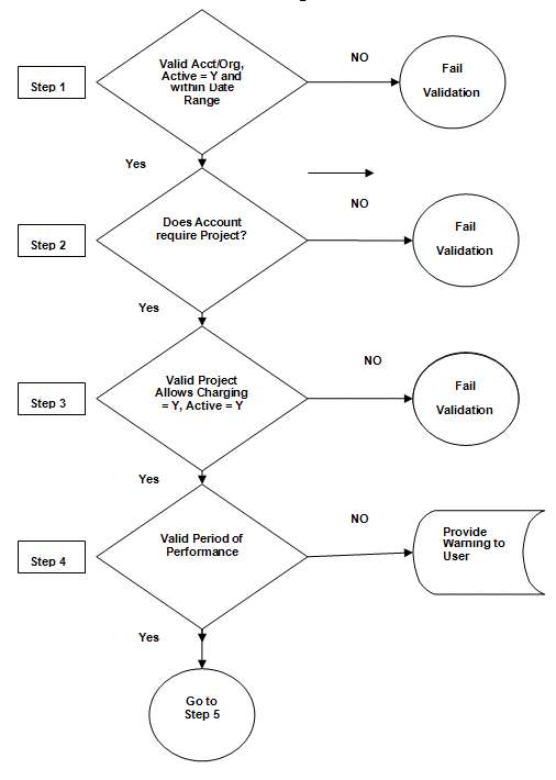 This flowchart displays Costpoint validations on project/account/organization combinations.