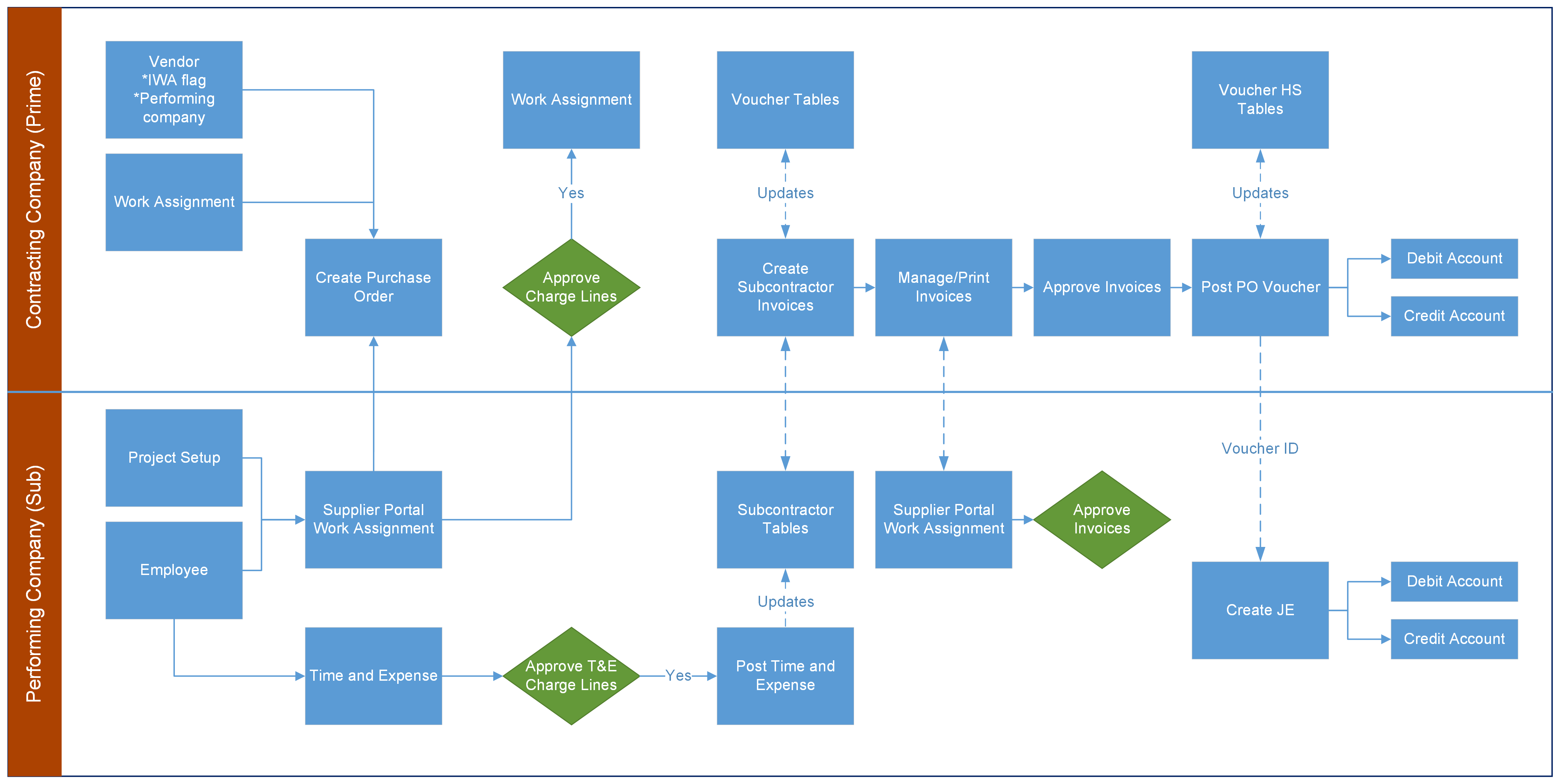For example, the contracting company is hiring employees from the performing company to do work or services for them as a subcontractor. The contracting company can set up the performing company as a vendor in their Costpoint database, create a purchase order (PO) and work assignment, and link those items to the vendor. The performing company will be able to update the charges applicable to the work subcontracted to them through the Supplier Portal module in the Materials domain. The performing company can also have its employees charge the work assignment through Time & Expense. When timesheets/expenses are approved by both companies, the intracompany allocations are created and ready to be posted. Intracompany payment can be automatic (via journal entries (JEs) to offset payable/receivable amounts) or can be manual (bank transfer, check, transfer of assets, and others).
