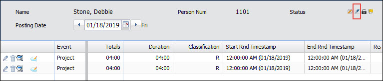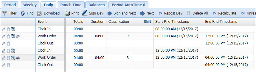 The Daily view of a split day will show both halves of a split day. If the day has punch transactions (as shown below), the employee will be clocked out and clocked back in when the day splits. See Posting Time on a Split Day for more information.