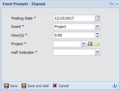 When you use Add Elapsed to post a transaction on a split day, use the Half Indicator event prompt to select which half of the day will receive the hours.