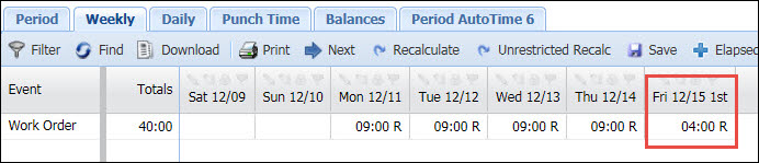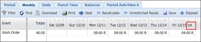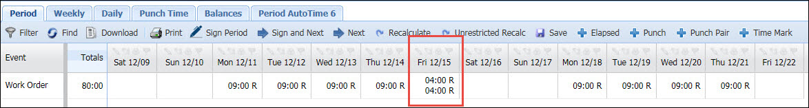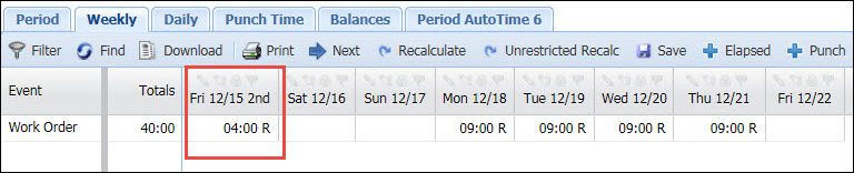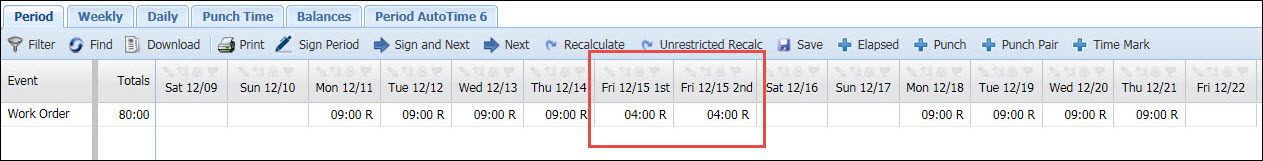 For example, a split day in a 9-80 schedule has the SECOND HALF set to Pay Period CURRENT and Pay Week NEXT. In this example, Friday 12/15 is the split day. Both halves are in the CURRENT period and are visible on the Period tab of the timecard.