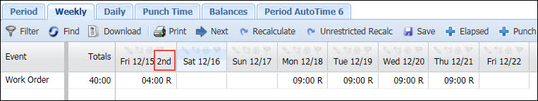 On the Weekly tab for the first week in the period (12/9 to 12/15), the Second Half of the split day does not appear.