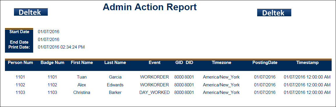The Admin Action Report shows a list of specific events (actions) based on filters such as Employee, GID/DID and posting date. This information can also be viewed in the Action form.