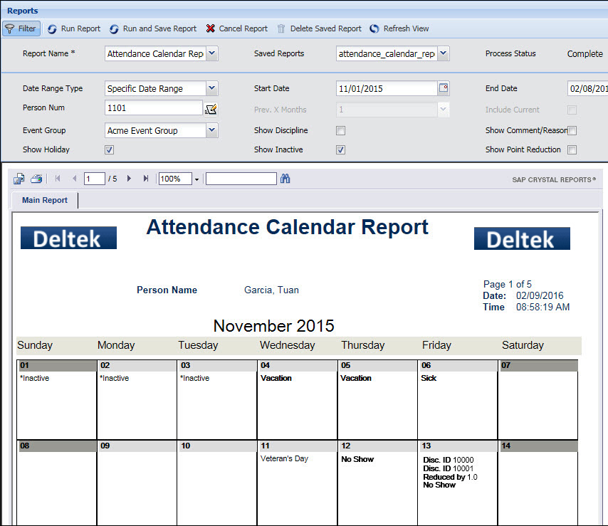 The calendar pages are similar to the Attendance Calendar form. The data that is displayed will depend on whether you selected and Event Group or checked Show Discipline, Show Comment/Reason, Show Holiday, Show Inactive, or Show Point Reduction.