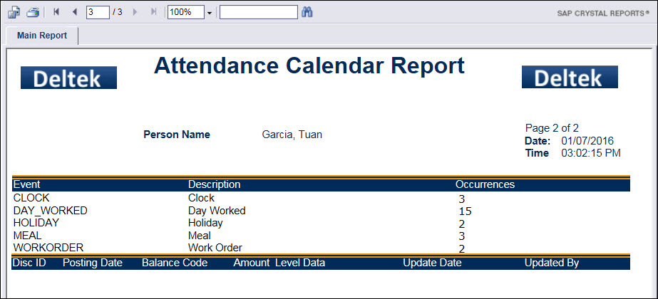 The report also includes a summary of the event postings (if an Event Group was selected) and a summary of any discipline balance changes.