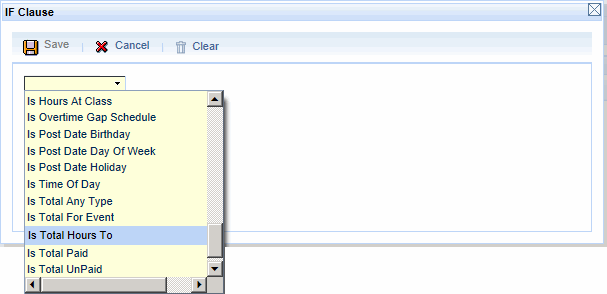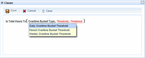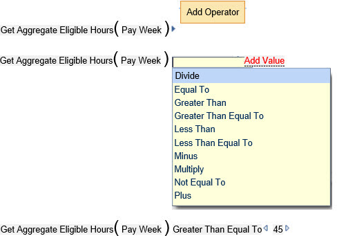 For example, an operator is used in the Get Aggregate Eligible Hours operand to see if there are 45 or more hours eligible for EWT/Comp Time in the pay week.