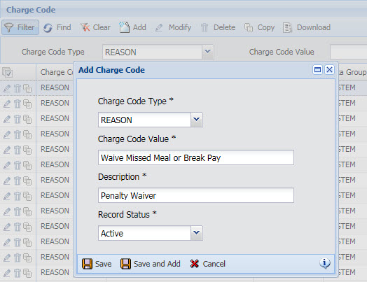 To define the Reason Code for the Penalty Waiver, use the Charge Code form.