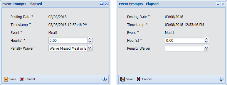 To indicate the penalty has been waived, the employee will select an option from the Penalty Waiver event prompt. This event prompt will be configured to display a list of Reason Codes. The Reason Code you select from the Penalty Waiver event prompt will determine whether the penalty event is posted.