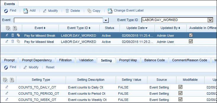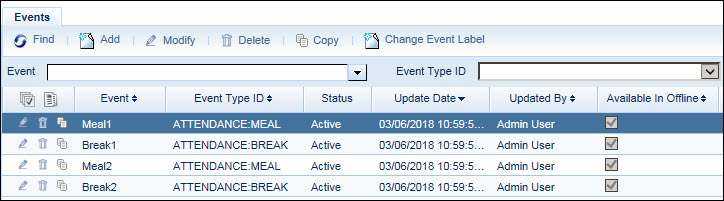 To define these events, use the Events form (Main Menu > Configuration > Event > Events). Make a copy of the TEMPLATE_MEAL and TEMPLATE_BREAK events.